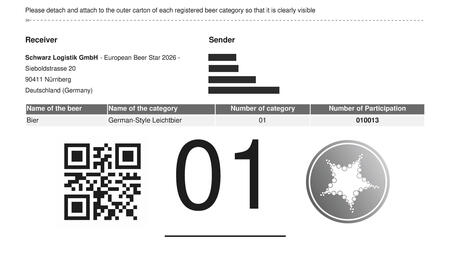 Bitte beachten sie, dass für jedes angemeldete Bier das mit der Auftragsbestätigung versandte Etikett mit QR-Code an der Verpackung der Biere angebracht werden muss (siehe auch Punkt "Etikettierung")