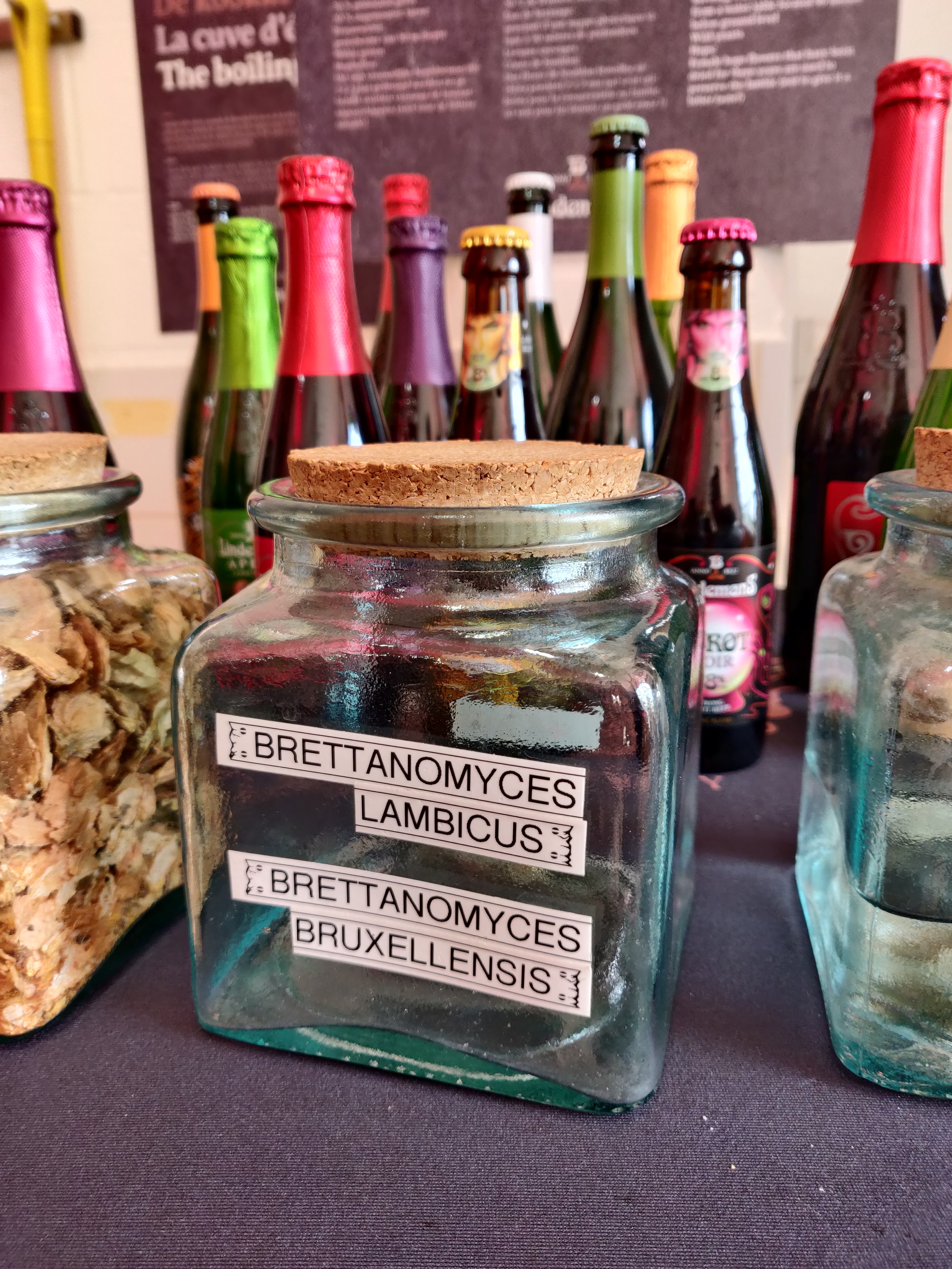 The beers are produced using the turbid haze method - again with the aim of avoiding the formation of 4-VG. To the surprise of German brewers, iodine normality is not as important as one would expect for German-style beers. This is due to the yeasts that are responsible for the fermentation process. In contrast to many other beer styles, Lambic beers are fermented spontaneously. After the boiling process, the wort is transferred to the coolship, where the wort comes into contact with the ambient air and is incubated during the cooling process, which should take place in as short a time as possible. Brettanomyces Bruxellensis and Brettanomyces Lambicus in particular, but also Saccharomyces yeasts and Pediococci determine the fermentation process. The mysticism takes its course... And the Lambic brewers know exactly what they are doing. This is because the provision of food (substrate) must be right in order to respond for the versatile microbes and their biotransformations. This is regulated by the brewhouse work. As Brettanomyces yeasts in particular can ferment almost all types of sugars at different speeds and the storage of Lambic can take place over several years, substrate must also be available for the long run. Therefore, in addition to mono- and disaccharides, oligo- and polysaccharides are also required after the mashing process. And that is the reason why Belgian Lambic brewers are not at all angry with a positive iodine sample before casting out of the brewhouse. The "raw material" yeast was presented in a very practical way at Lindemans :-)